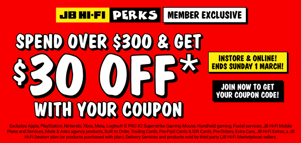 *Perks Coupon valid on one eligible transaction over $300. Expires 11:59PM AEDT on 01/03/26. Coupon cannot be used in conjunction with any other coupon. Discount of $30 applies to the current ticketed price of relevant products. Perks Coupon can be redeemed by adding the coupon to your online transaction, or by presenting the coupon at Australian stores, excluding Airport locations. Perks Coupons are special offers available to Perks members only and discount applies to the current ticketed prices of relevant products for non-Perks members. As prices change regularly, and we frequently run sales and negotiate on price, some products are likely to have been sold below the current ticketed prices prior to this offer. Prices may change after this offer ends.