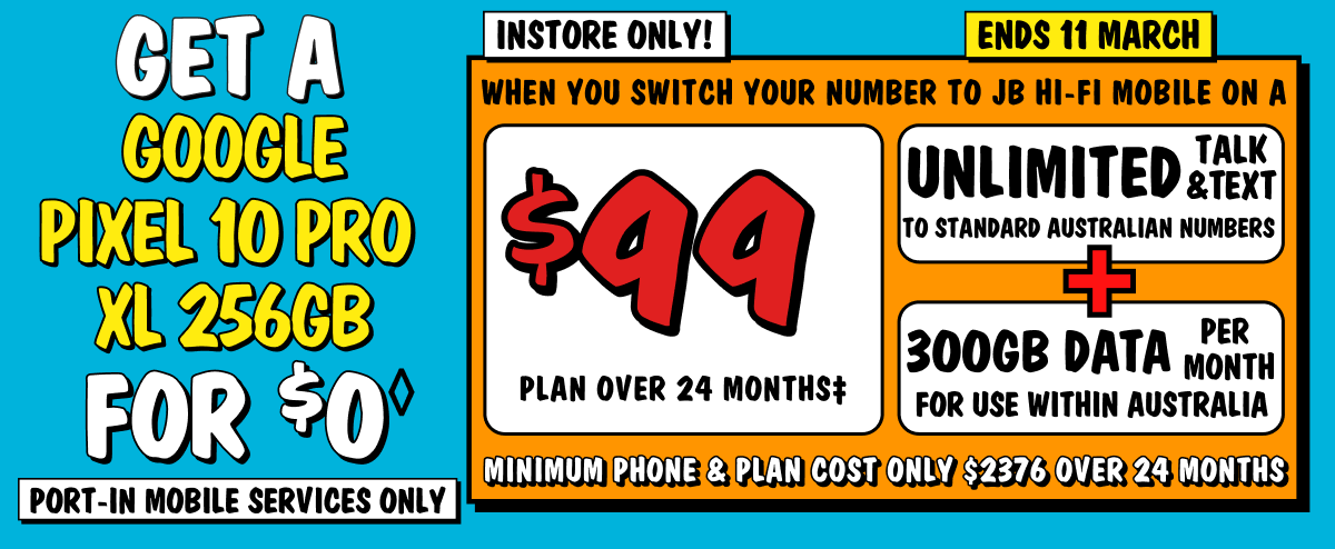 ◊Offer only available to eligible port-in mobile services (being an existing mobile service transferred from another provider, excluding any service that has been active on a Telstra, JB Hi-Fi, The Good Guys, or Boost plan at any time in the 30 days before the transfer). The Google Pixel 10 Pro XL 256GB (referred to as the "JB Hi-Fi Voucher" in the Telstra Terms and Conditions available at www.telstra.com.au/jbhifi-mobile-terms replaces the dollar value of the Voucher in the Critical Information Summary and will be available to you instore after connection approval by Telstra. If you cancel or move to a lower cost/different plan then you must pay a Voucher Repayment Fee to Telstra pro-rated against the remaining months of your plan's minimum term. This offer is not available in conjunction with any other JB Hi-Fi mobile or broadband OR TRADE IN offer and is limited to 3 connections per customer. ‡Speeds may vary due to various factors such as location, hardware and network congestion. If you exceed your data allowance, your speed will be capped at 1.5Mbps. Speed is slowed further in busy periods. For full Terms & Conditions and Critical Information Summary visit www.jbhifi.com.au/mobile-plans. Available instore only.