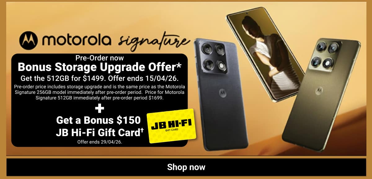 *Storage (ROM) upgrade offer valid for AU residents who pre-order a Motorola Signature 512GB between 12.01am AEDT 26/03/26 and 11:59pm AEST 15/04/26. Limit of 5 per customer. Offer available instore, online and by phone. Not available in conjunction with any other offer unless specified. Not available on commercial sales. Excludes products purchased from third party (JB Hi-Fi Marketplace) sellers.