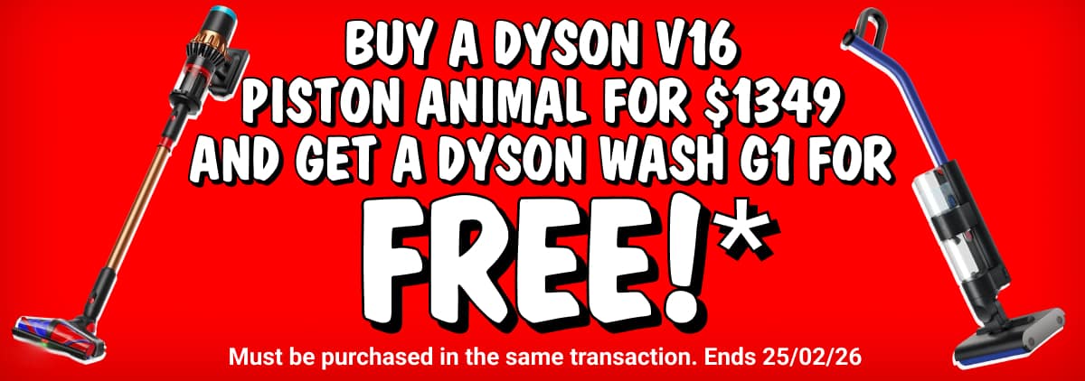*Offer starts 05/02/2026 and ends 25/02/ 2026 11.59pm AEST. Offer available instore, online and by phone and is issued at point of sale for purchases instore or must be added to the cart for purchases online. Excludes products purchased from third party (JB Hi-Fi Marketplace) sellers. Full payment must be made by promotion close date. Limit of one Wash G1 per customer with every V16 Animal Purcashe/per docket/per email address]. Excludes commercial orders.Not available in conjunction with any other offer. Offer ends 25 Feb 2026