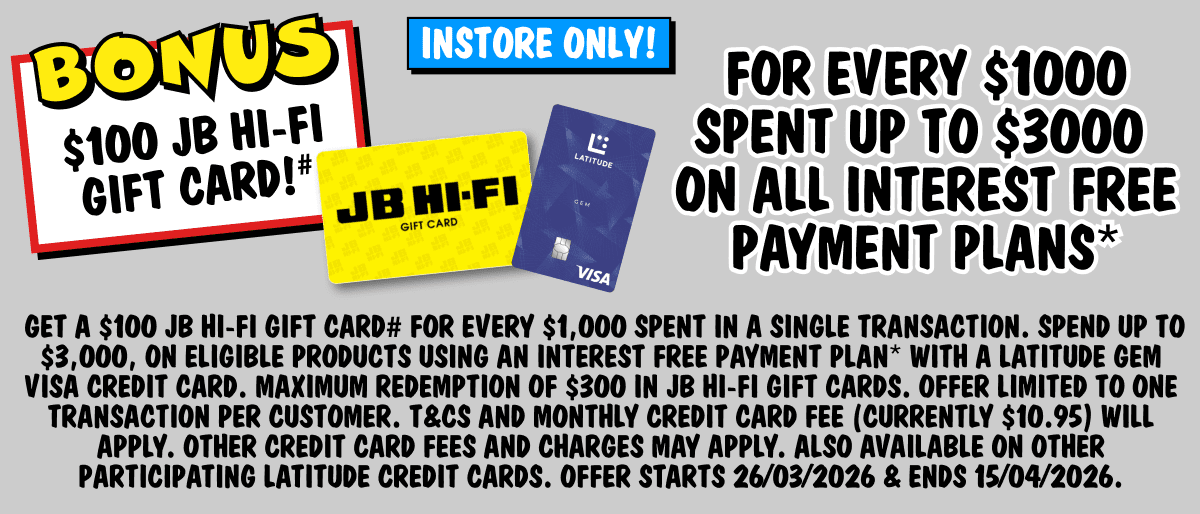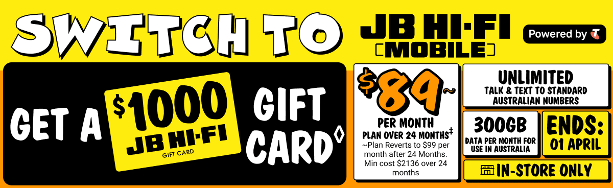 ◊Offer only available for new mobile services and eligible port-in mobile services (being an existing mobile service transferred from another provider, excluding any service that has been active on a Telstra, JB Hi-Fi, The Good Guys, or Boost plan at any time in the 30 days before the transfer). The JB Hi-Fi Gift Card (referred to as the "JB Hi-Fi Voucher" in the Telstra Terms and Conditions available at www.telstra.com.au/jbhifi-mobile-terms) will be available to you in store after connection approval by Telstra. The $1000 JB Hi-Fi Gift Card replaces the value of the Voucher stated in the Critical Information Summary. If you cancel or move to a lower cost/different plan then you must pay a Voucher Repayment Fee to Telstra pro-rated against the remaining months of your plan's minimum term. This offer is not available in conjunction with any other JB Hi-Fi Mobile or Broadband offer and is limited to 3 connections per customer. Gift Card subject to Terms and Conditions available at www.jbhifi.com.au/giftcardterms