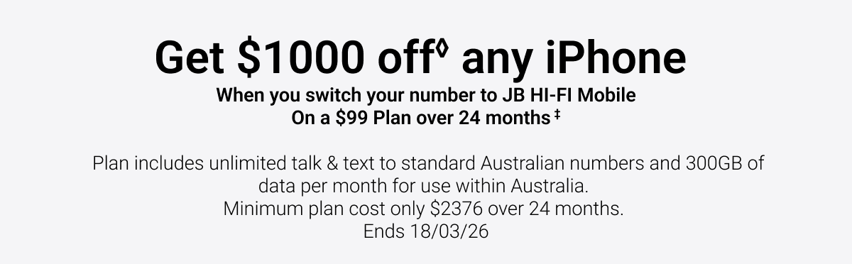 ◊Offer only available for new mobile services and eligible port-in mobile services (being an existing mobile service transferred from another provider, excluding any service that has been active on a Telstra, JB Hi-Fi, The Good Guys, or Boost plan at any time in the 30 days before the transfer). The $1000 off the current ticketed price of any iPhone (referred to as the "JB Hi-Fi Voucher" in the Telstra Terms and Conditions available at