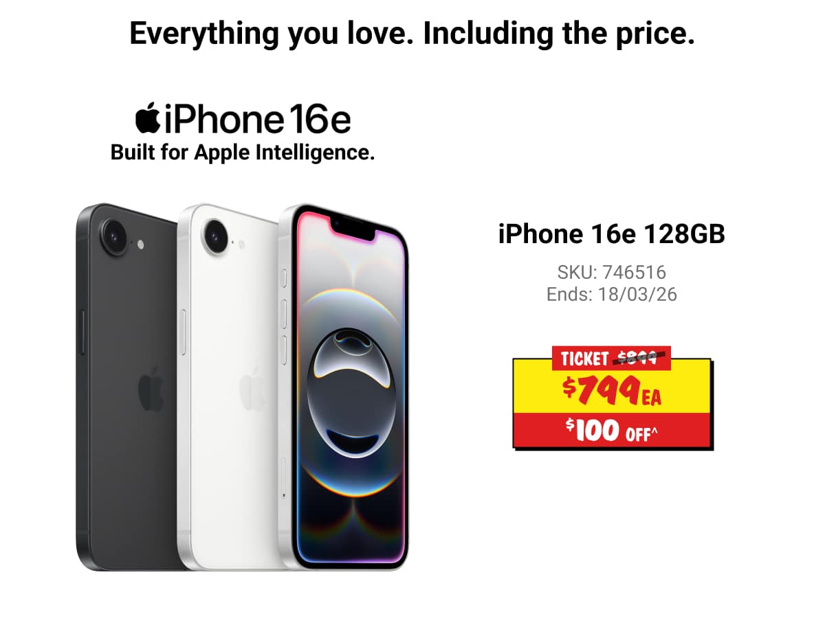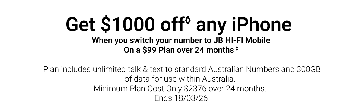 ◊Offer only available for new mobile services and eligible port-in mobile services (being an existing mobile service transferred from another provider, excluding any service that has been active on a Telstra, JB Hi-Fi, The Good Guys, or Boost plan at any time in the 30 days before the transfer). The $1000 off the current ticketed price of any iPhone (referred to as the "JB Hi-Fi Voucher" in the Telstra Terms and Conditions available at