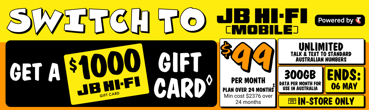 ◊Offer only available for new mobile services and eligible port-in mobile services (being an existing mobile service transferred from another provider, excluding any service that has been active on a Telstra, JB Hi-Fi, The Good Guys, or Boost plan at any time in the 30 days before the transfer). The JB Hi-Fi Gift Card (referred to as the "JB Hi-Fi Voucher" in the Telstra Terms and Conditions available at www.telstra.com.au/jbhifi-mobile-terms) will be available to you in store after connection approval by Telstra. The $1000 JB Hi-Fi Gift Card replaces the value of the Voucher stated in the Critical Information Summary. If you cancel or move to a lower cost/different plan then you must pay a Voucher Repayment Fee to Telstra pro-rated against the remaining months of your plan's minimum term. This offer is not available in conjunction with any other JB Hi-Fi Mobile or Broadband offer and is limited to 3 connections per customer. Gift Card subject to Terms and Conditions available at www.jbhifi.com.au/giftcardterms