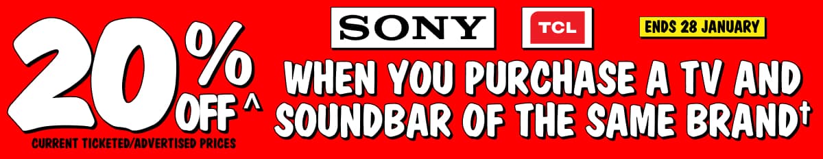 †When Purchased in the Same Transaction. Excludes JB Hi-Fi Marketplace Products. Discount is applied at point of sale in store and applied automatically at cart if purchased online. This offer applies to current ticketed/advertised prices. Prices of some products are likely to have changed and may have increased prior to this offer. Because of this and as we regularly negotiate on price, some products are likely to have been sold below the current ticketed/ advertised prior to this offer. Prices may change after this offer. If TV or Soundbar is returned for eligible change of mind, offer will be forfeited and offer amount will be deducted from refund amount. Offer ends 28/01/26.