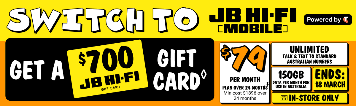 ◊Offer only available for new mobile services and eligible port-in mobile services (being an existing mobile service transferred from another provider, excluding any service that has been active on a Telstra, JB Hi-Fi, The Good Guys, or Boost plan at any time in the 30 days before the transfer). The JB Hi-Fi Gift Card (referred to as the "JB Hi-Fi Voucher" in the Telstra Terms and Conditions available at www.telstra.com.au/jbhifi-mobile-terms) will be available to you in store after connection approval by Telstra. The $700 JB Hi-Fi Gift Card replaces the value of the Voucher stated in the Critical Information Summary. If you cancel or move to a lower cost/different plan then you must pay a Voucher Repayment Fee to Telstra pro-rated against the remaining months of your plan's minimum term. This offer is not available in conjunction with any other JB Hi-Fi Mobile or Broadband offer and is limited to 3 connections per customer. Gift Card subject to Terms and Conditions available at www.jbhifi.com.au/giftcardterms