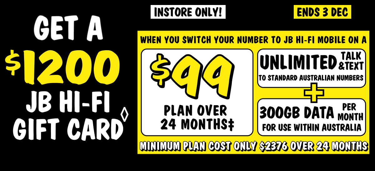 ◊Offer available to port-in mobile services (excluding JB Upfront/Prepaid, The Good Guys Mobile & Broadband, Telstra & Boost) and new Telstra mobile service customers only. The JB Hi-Fi Gift Card (referred to as the "JB Hi-Fi Voucher" in the Telstra Terms and Conditions available at www.telstra.com.au/jbhifi-mobile-terms) will be available to you instore after connection approval by Telstra. The $1200 JB Hi-Fi Gift Card replaces the value of the Voucher stated in the Critical Information Summary. If you cancel or move to a lower cost/different plan then you must pay a Voucher Repayment Fee to Telstra pro-rated against the remaining months of your plan's minimum term. This offer is not available in conjunction with any other JB Hi-Fi mobile or broadband offer and is limited to 3 connections per customer. Gift Card subject to Terms and Conditions available at www.jbhifi.com.au/giftcardterms .
