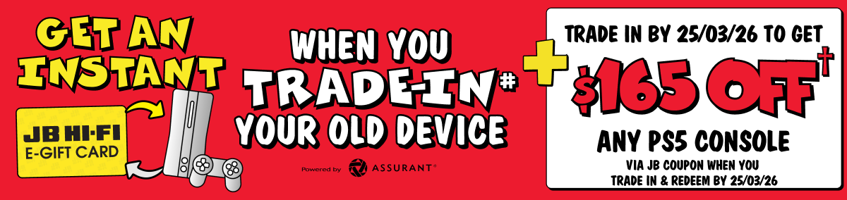 †Customers who complete a trade-in with a trade-in value of at least $1 will receive an email offer to select from available JB Hi-Fi coupon(s) for a discount on the next purchase of specific product(s). The selected coupon(s) will be sent via email and are redeemable instore or online in a single transaction (excluding airport stores). Coupon(s) cannot be used in conjunction with any other promotion or offer, or for products purchased together with a JB Hi-Fi Device+ plan. Balance is not redeemable for cash. Coupon(s) apply to the current ticketed price of relevant product(s). As prices change regularly and as we frequently run sales and negotiate on price, some products are likely to have been sold below the current price prior to this offer. Prices may change after offer ends.