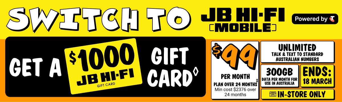 ◊Offer only available for new mobile services and eligible port-in mobile services (being an existing mobile service transferred from another provider, excluding any service that has been active on a Telstra, JB Hi-Fi, The Good Guys, or Boost plan at any time in the 30 days before the transfer). The JB Hi-Fi Gift Card (referred to as the "JB Hi-Fi Voucher" in the Telstra Terms and Conditions available at www.telstra.com.au/jbhifi-mobile-terms) will be available to you in store after connection approval by Telstra. The $1000 JB Hi-Fi Gift Card replaces the value of the Voucher stated in the Critical Information Summary. If you cancel or move to a lower cost/different plan then you must pay a Voucher Repayment Fee to Telstra pro-rated against the remaining months of your plan's minimum term. This offer is not available in conjunction with any other JB Hi-Fi Mobile or Broadband offer and is limited to 3 connections per customer. Gift Card subject to Terms and Conditions available at www.jbhifi.com.au/giftcardterms