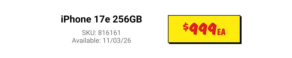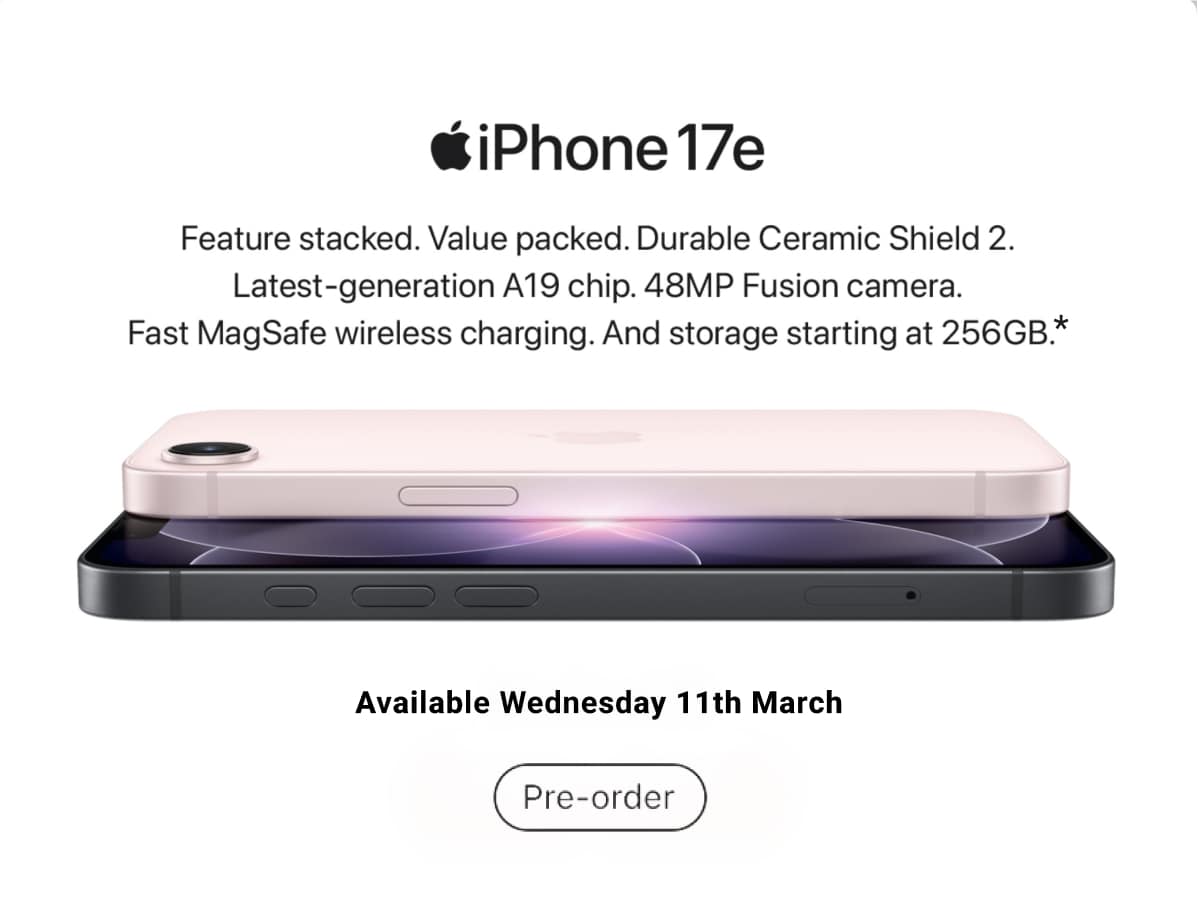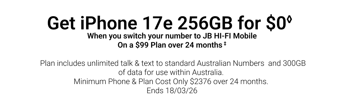 ◊Offer only available for new mobile services and eligible port-in mobile services (being an existing mobile service transferred from another provider, excluding any service that has been active on a Telstra, JB Hi-Fi, The Good Guys, or Boost plan at any time in the 30 days before the transfer). The Apple iPhone 17E 256GB (referred to as the "JB Hi-Fi Voucher" in the Telstra Terms and Conditions available at www.telstra.com.au/jbhifi-mobile-terms) replaces the dollar value of the Voucher in the Critical Information Summary and will be available to you instore after connection approval by Telstra. If you cancel or move to a lower cost/different plan then you must pay a Voucher Repayment Fee to Telstra pro-rated against the remaining months of your plan's minimum term. This offer is not available in conjunction with any other JB Hi-Fi mobile or broadband offer and is limited to 3 connections per customer.